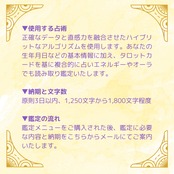 正確なデータと直感的なリーディングを融合した、独自のハイブリッド占術を採用。生年月日を中心に、タロットカード・星読み・数秘術・エネルギーリーディングなど、必要に応じて複数の術式を組み合わせて鑑定します。