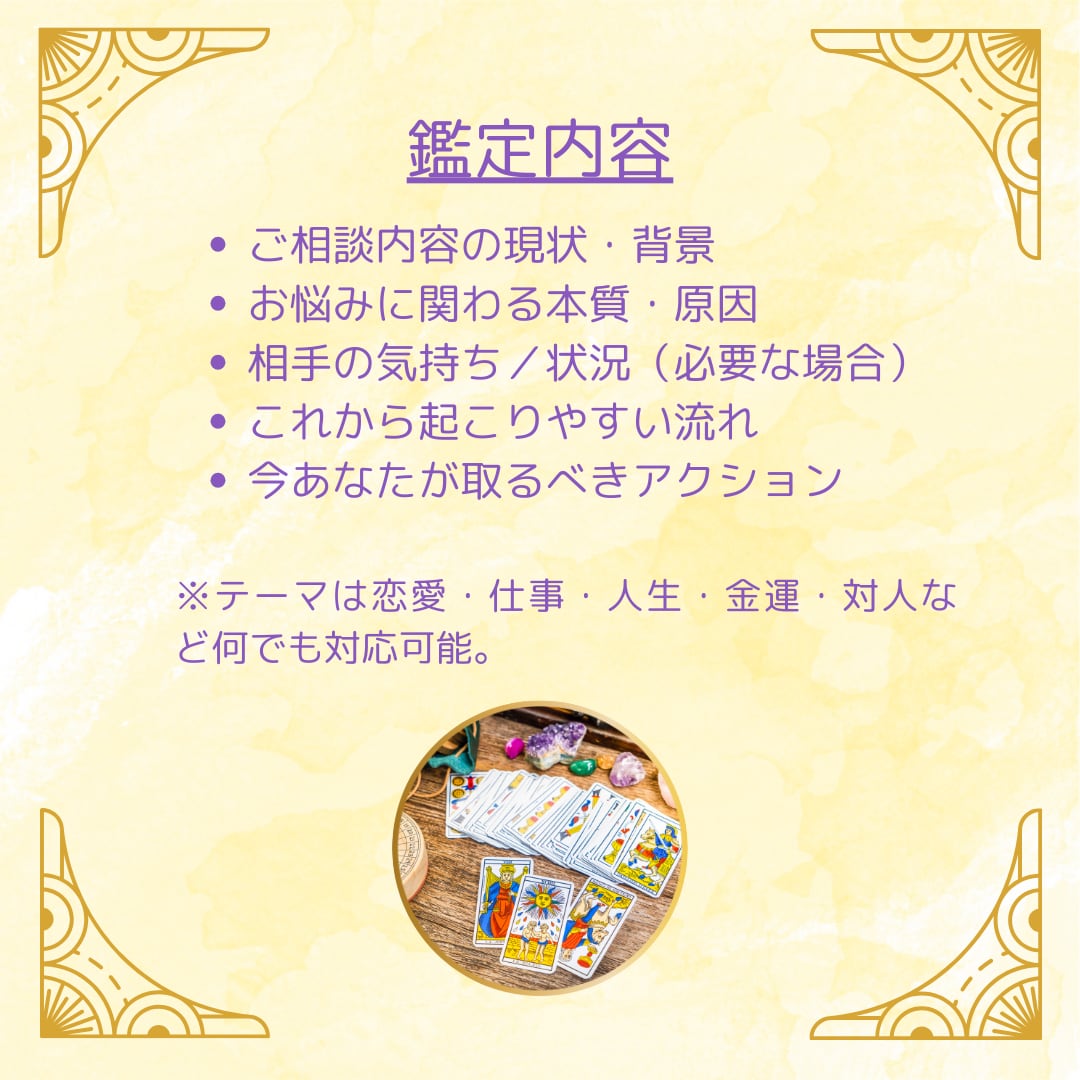 ※鑑定は1件のみとなります。複数のテーマをご希望の場合は、恋愛総合・結婚総合・仕事総合・金運総合をご利用ください。